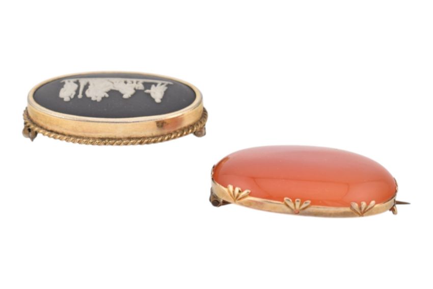 A black Wedgwood Jasperware brooch 4.1cm, a carnelian brooch pin 3.8cm and a pair of gold filled carved shell cameo earrings and a pendant. Total weight 29.2g.