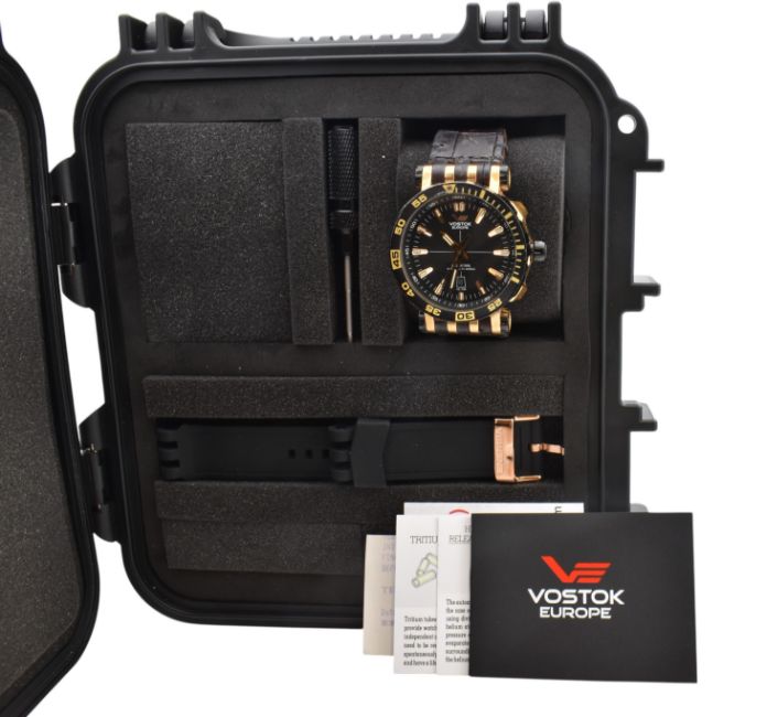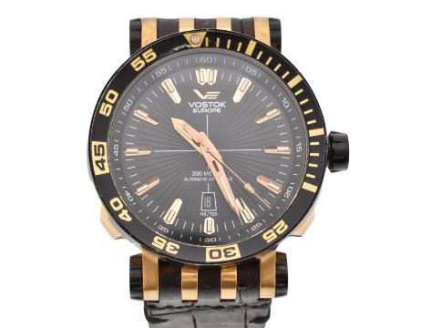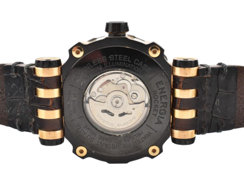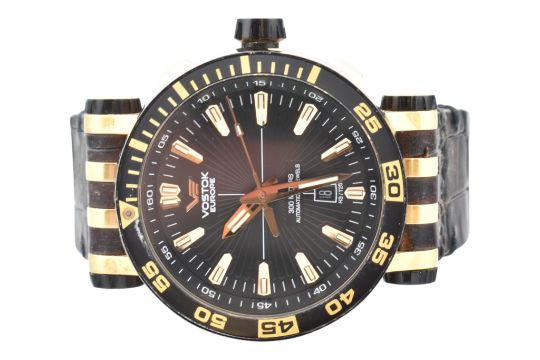 A Vostok Europe Energia Rocket automatic gentlemen's wristwatch with a NH35A movement. Black and rose gold case with a black leather strap. Main features include: stainless steel case, Tritium illumination, Helium release and water resistant to 30 ATM. The watch comes with a box, spare strap and screwdriver. Approx case diameter: 48mm