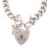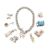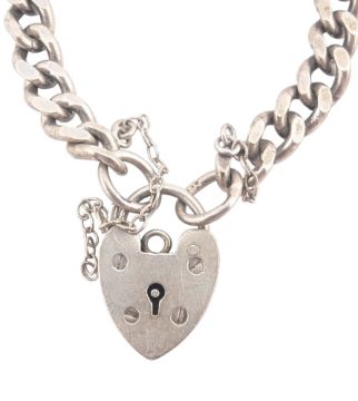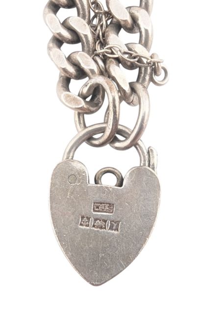 A 1970s silver charm bracelet and white metal charms. The 1970s curb link bracelet having a hallmarked padlock clasp and hallmarked jump ring, with associated charms including a fish charm stamped ST SIL, church, a spinning wheel, poodle, Beefeater, saucepan, Welsh dragon. Total weight 45.5g. Measures 19cm