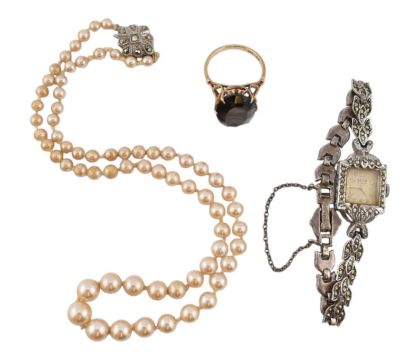 A 9ct gold and smoky quartz dress ring. Together with a simulated pearl necklace with silver and marcasite set clasp. A stainless steel Avia wristwatch with marcasite set case and strap. The watch ticking at time of cataloguing but not guranteed to continue to do so. Ring 5.2g. Size R.5.