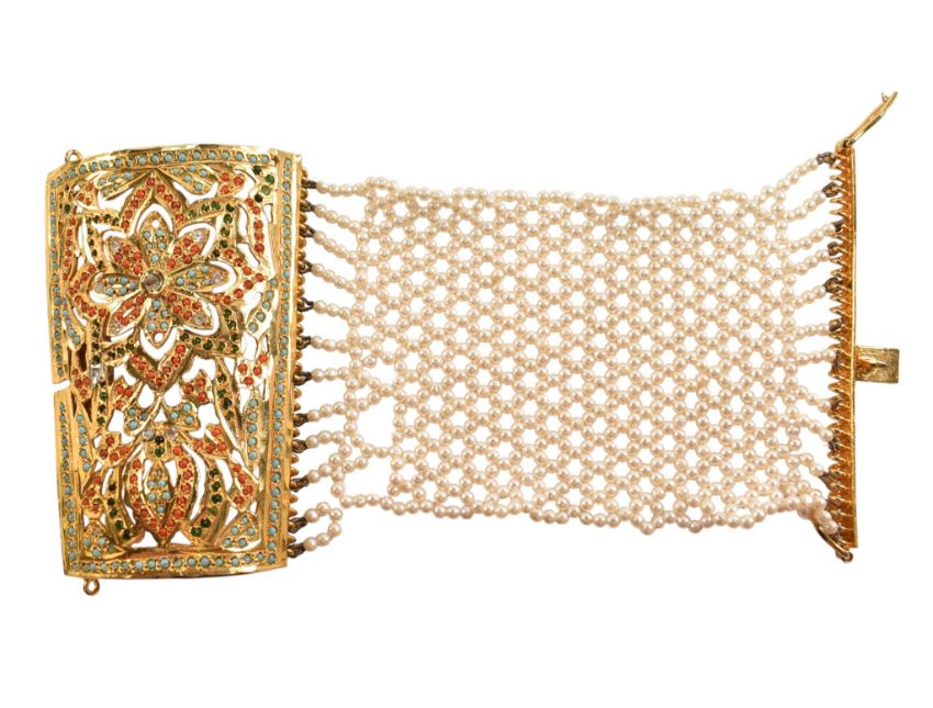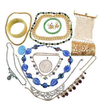An assortment of costume jewellery. The jewellery to include two vintage Italian glass bead necklaces. An Indian bangle with an oversized clasp. A carved stone bangle. Rhinestone set necklaces. A mother of pearl flower pendant. A pair of stud earrings.