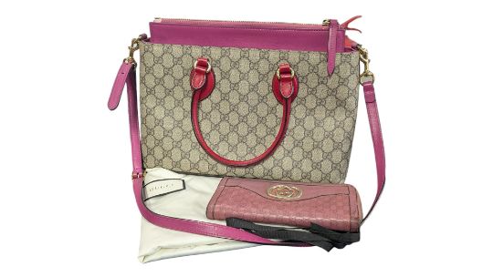 Contemporary Gucci convertible shoulder bag model 409534 with Gucci pink purse (AF). The Gucci convertible shoulder bag with pink and red leather straps and a GG supreme canvas body. Gucci label with number to the inside and housed in an associated fabric bag. Bag measuring approx. 24cm x 33cm x 12.
