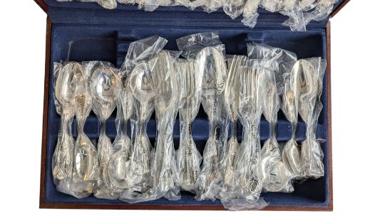 Viners - Late 20th century Kings Royale silver plated eight person setting canteen of cutlery. To include dinner forks, dinner knives, dessert knives, dessert forks, dessert spoons, teaspoons, tablespoons, and soup spoons. Housed within the original box. Measuring approx. 7.5cm x 45cm x 29.5cm.