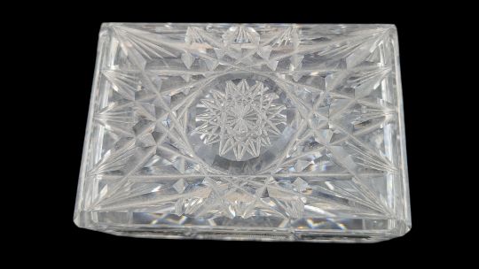 20th century vintage crystal cut glass dressing table lidded box with two candle holders. Lidded box measuring approx. 6cm x 12cm x 8.5cm. Accompanied with two cards from the President of Bank Handlowy in Warsaw.