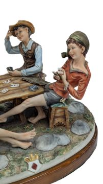 Capodimonte - The Cheaters - A large 20th century Italian Capodimonte porcelain group figure entitled 'The Cheaters' to depict a group of boys playing a game of cards at the table. Hand painted. Signed and having the N Crown symbol. Raised on a wooden plinth base with green underside. Measures 43cm length 43cm height approx.