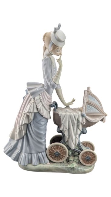 Lladro - Late 20th century porcelain Baby's Outing 4938 figure. Depicting a mother in a long dress looking at a baby in a pram on a naturalistic base. Marked to the base. Measuring approx. 33cm tall.
