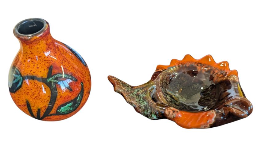 Collection of mid to late 20th century studio pottery. To include a Poole Delphis small bud vase, an unmarked manner of Poole Delphis footed bowl, a manner of Vallauris fat lava fish shaped ashtray, an Alan Clarke 2007 Collector's Society droplet shaped dish, a Poole Thistlewood patterned plate, and a Poole ship design plate. Most marked to their bases. Thistlewood plate measuring approx. 25.5cm in diameter.