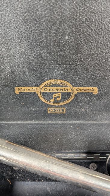 Early 20th century Columbia Viva-Tonal Grafonola portable gramophone model 112. Makers mark to the interior. Housed in a black leather wooden case. Measuring approx. 38cm x 28.5cm x 15.5cm.