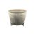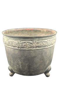 Believed to be a 17th century Chinese bronze footed pot / censer. Of circular form with a geometric patterned band below the pot's rim and raised on three rounded feet. Measuring approx. 9cm x 11cm x 11cm.
