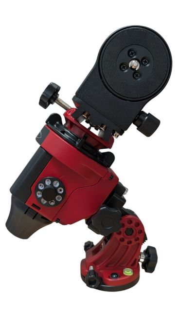 Sky Watcher Star Adventurer Astrophotography equatorial tracking mount. Featuring the body alongside accessories: polar scope illuminator, fine-tuning mounting assembly, equatorial wedge, counterweight, and cable. Instruction manual present.