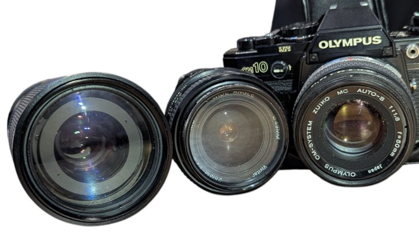 Olympus OM10 SLR film camera with lenses, flash, and carry bag. To include an Olympus 50mm 1:1,8 lens, a Tamron 80-210mm lens, a Vivitar 28mm lens, an Olympus flash, and a Nikon camera bag. Camera measuring approx. 14cm x 8.5cm x 9cm.