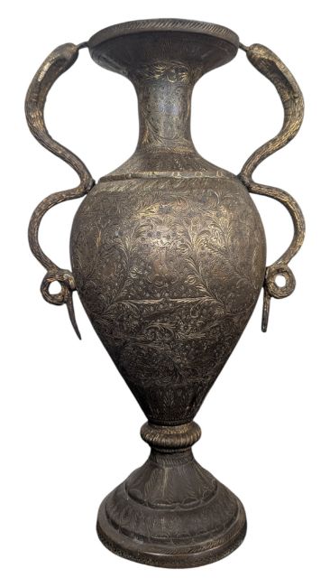 Two late 19th / early 20th century Balinese brass and copper baluster shaped vases / urns. To include a brass vase / urn decorated with ornate engravings of foliage and figures, featuring snake shaped twin handles, and a lidded copper vase / urn decorated with repousse panelled florals. Largest piece measuring approx. 41cm tall.