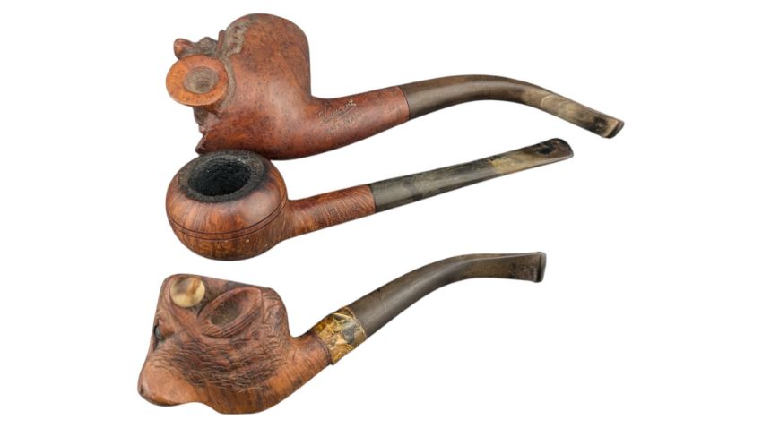 Collection of 20th century vintage carved novelty pipes. To include a bull shaped example with real horn, a dog with a bugle example by Roger Vincent, France, a walnut carved pipe by A. Plumb, London, and a hunting horn and Meerschaum pipe in case. Largest pipe measuring approx. 16cm in length.