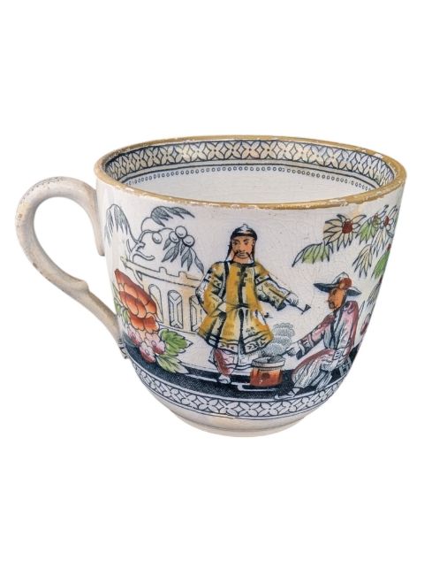 19th century Chinese Famille Verte ginger jar with two Beech and Hancock cups. Ginger jar decorated with hand painted figures and geometric border in a red and green colourway, with lid present (AF). Accompanied by two Beech and Hancock cups decorated with Chinese traditional figures and hand painted polychrome additions. Largest piece measuring approx. 11cm tall. Sold as seen.