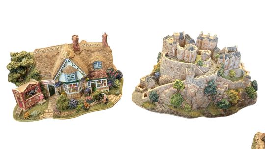 Lilliput Lane - Collection of late 20th / 21st century unboxed resin cottage figures. To include Derwent Le Dale, Edinburgh Castle, Sweets & Treats, Wash Day, Eriskay Croft, Nutkin Cottage, Woodman's Retreat, Puddlebrook, and more. Pieces marked to the base. 17 figures present.
