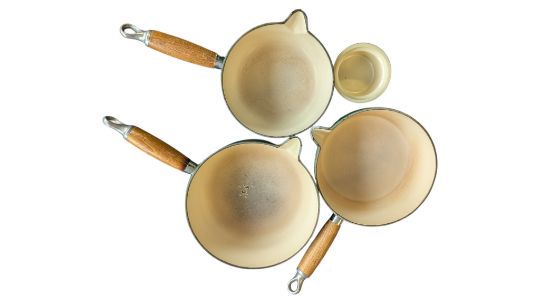 Collection of late 20th century green Le Creuset saucepans & pot. The saucepans in the sizes 16, 18, 20, all with lids, a pouring spout and wooden handles. The pot measures 8cm. All with the makers mark.