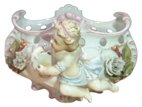 Four 20th century continental porcelain ornamental figures. Comprising of a German bisque porcelain child figure dressed in Victorian clothing, another example of a man dressed in Rococo style clothing, a Depose porcelain jardiniere planter featuring a relief cherub playing a tambourine to the front, and an Art Nouveau vase decorated with a female figure carrying water buckets. Sold as seen. Largest piece measuring approx. 30cm tall.