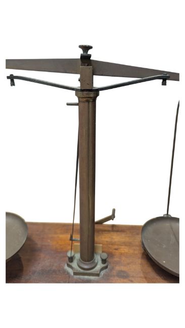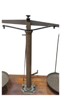 A Victorian 19th century mahogany and brass weighing scales. The scales complete with a cased set of weights. Measuring approx. 29cm x 39cm x 15.5cm.