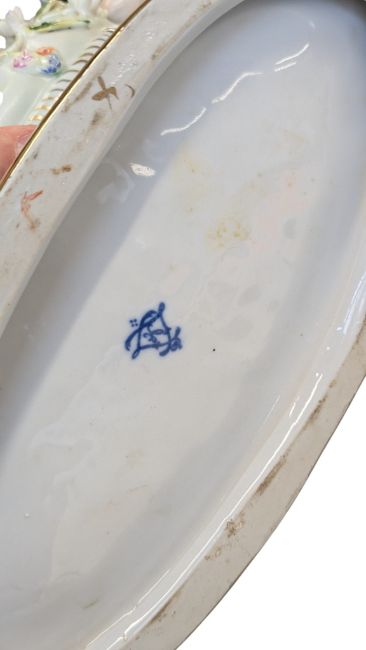 A 20th century German Dresden style porcelain centre piece having figural putti to each side with floral encrustations to body and gilt painted meander to base. Sèvres porcelain manufactory mark to underside. Together with a Limoges style French jewellery box with Rococo Fragonard type courting couple to top.