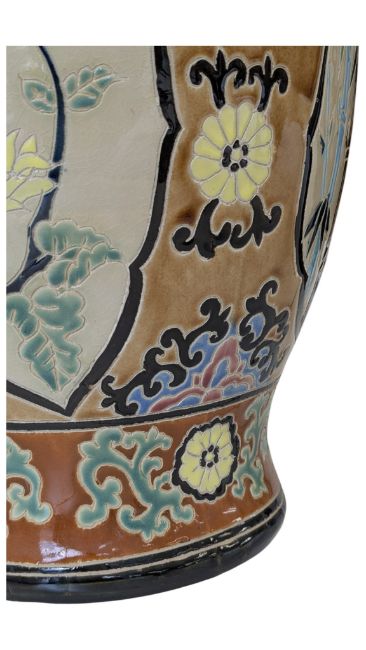 A late 19th century ceramic large Chinese export vase. Having a flared rim into a bulbous body and circular base. Floral designs to shaped panels, with further design to borders. Brown / cream colourway.