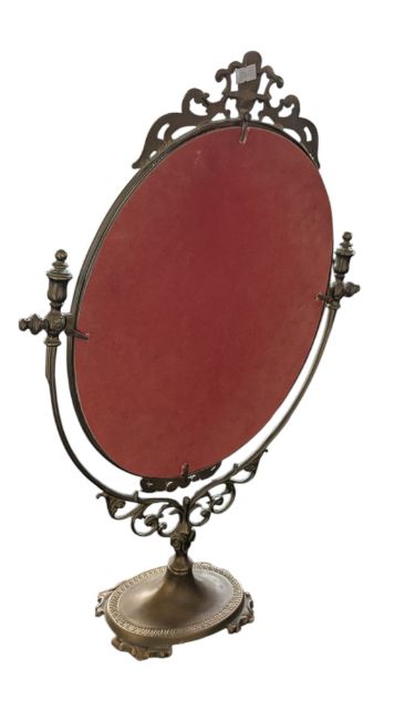 A 20th century brass french style easel table mirror. Raised on oval base over shaped feet, having acanthus leaf style decoration to top.