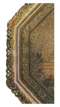 A 19th century Indian Kashmiri Indo-Persian brass charger. The charger of octagonal form and being richly inscribed with figures and foliates, with a pierced and scalloped edge. Measuring approx. 50cm x 50cm.
