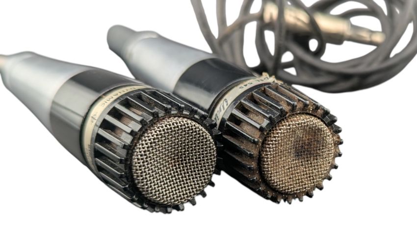 Two 1960s Shure Unidyme III vintage microphones. Comprising model 545 and model 544, both with cables. The microphone body measuring approx. 14.5cm in length.