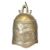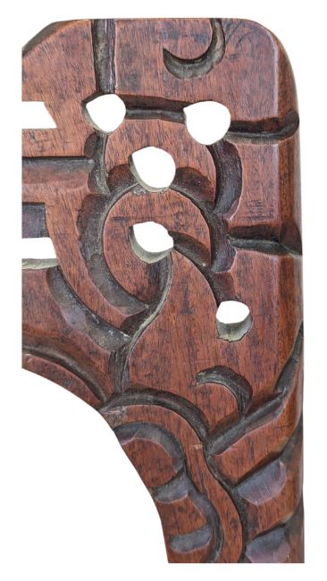 A vintage 20th century brass Chinese table / temple bell. Of dome form with embossed dragon figure, being hung on a carved wooden Chinese block with pierced decoration.