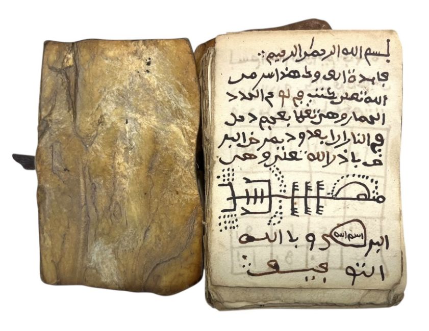 Early 19th-century Islamic Taweez, containing handwritten prayers, charms, and verses of the Quran in Arabic. The pouch intended for protection and guidance. Believed North/West African. Comprised of approximately 150 leaves, disbound, as intended, held in a leather wrap tied with a morocco cord featuring a cowrie shell. Taweez pouch is a slightly worn calf with a cloth strap and decorative leather adornments. Leather cover has detached from the lining to the flap and rear of the pouch, with a tear along each edge.