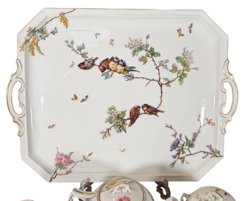 Limoges - a late 19th century French hand-painted porcelain tea service and tray. The six-person service comprises six cups & suacers, teapot, lidded sugar bowl, milk jug / creamer and a large twin-handled tray. Each piece hand-painted with floral decorations with butterfly detailing.