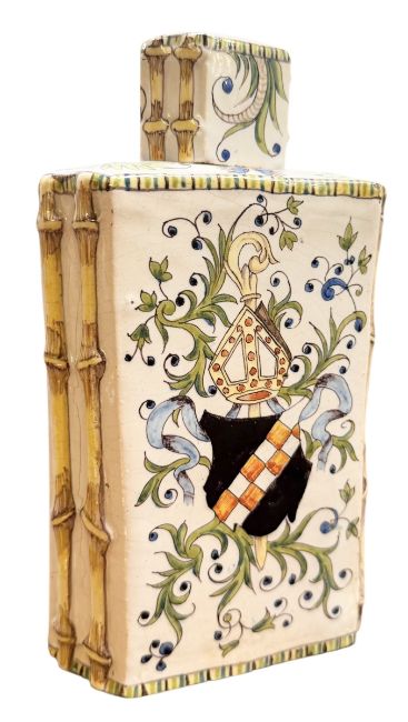 A Continental, possibly Italian, mid 19th century faience hand painted ceramic lidded tea caddy/canister. The caddy of triangular form with bamboo relief details to each corner. Each panel painted with Classical-inspired attributes and one side with family crest. The lid with matching decorations. Signed NE to underside.
