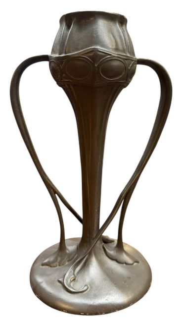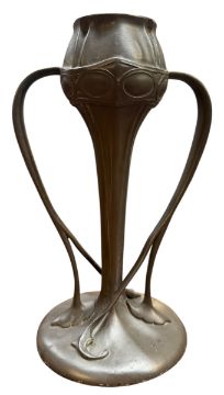 Archibald Knox (1864-1933) for Liberty & Co - a circa 1900 Tudric pewter twin handled vase. The vase with tulip shaped head over scrolled twin handles. Repeating stylised motifs all raised on a circular base. Impressed 'Tudric 029' to the base.