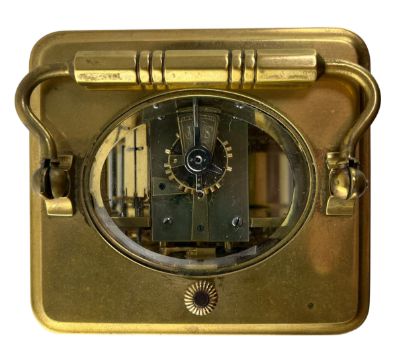 A late 19th / early 20th-century SF brass-cased carriage clock. The carriage clock with an enamel dial and a Roman numeral chapter ring. With a twin-barrel mechanism. Marked SF in two places to the internal mechanism. With a label and scratched reference marks to the underside. Two keys present.