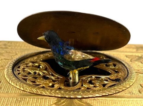 A circa 1900 Continental gilt brass musical automata box. With an engraved oval hinged lid opening to reveal an animated bird with pierced scroll grille. With a compartment to the rear of the box, containing the key and a folded article entitled American's Love of Novelty. Singing Bird. Bird features iridescent blue and red feathers, with a detailed engraved floral and foliage design to box. Sliding mechanism to the front edge and turning fob to the underside. In working order, however mechanism catching on certain parts of the cycle. No maker's marks.