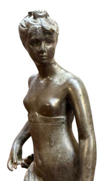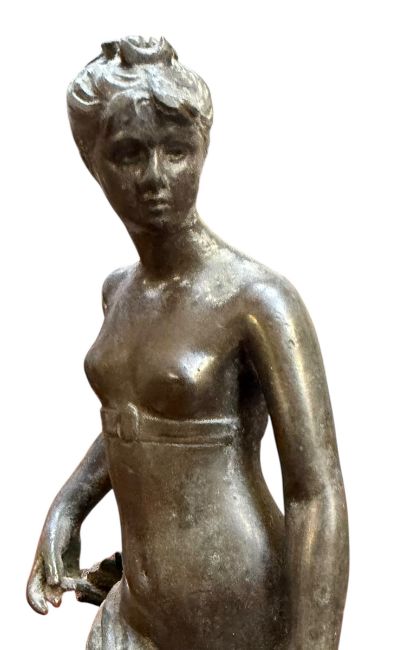 After Mathurin Moreau (1822-1912) - Venus Au Bain - a French early 20th century patinated bronze and marble figure of Venus. The statuette signed to base. All raised on a reeded column like marble plinth base.