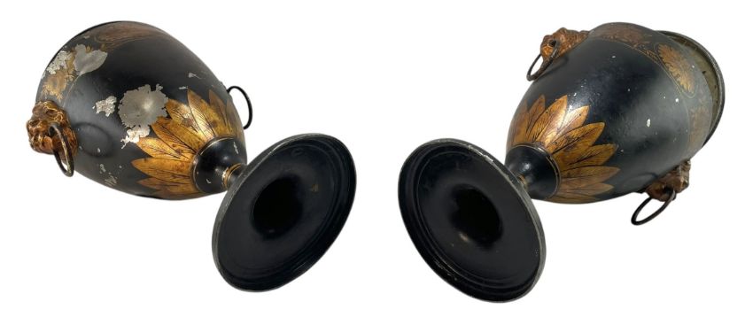 A pair of 19th century painted pewter tole chestnut urns with covers. Each lidded vase with a finial to lids and lion-shaped ring handles. The tapering body raised on a circular foot base. All painted in dark green with gilt banding and foliate motifs. Some flaking of the paint present.