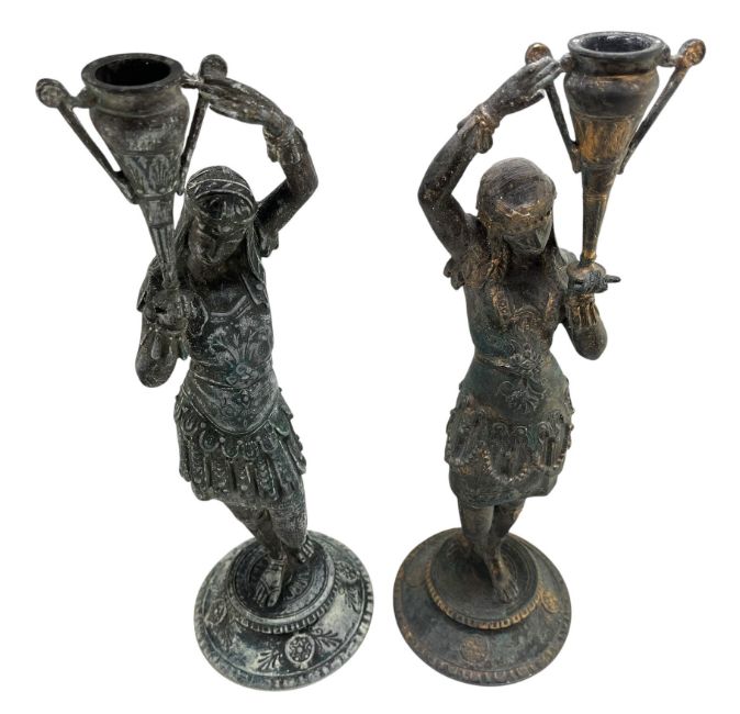 A pair of Egyptian Revival spelter figural candelabras /candlesticks. Each depicting a female figure holding an urn/vase. All raised on stepped circular plinth bases.