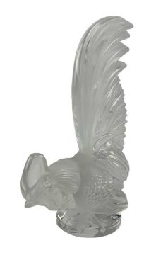 Lalique - Cockerel - a French crystal glass figurine / ornament. Frosted glass Cockerel with detailed features raised on a clear glass base. Signed with label to the verso. Measures approx. 22cm x 13cm.