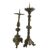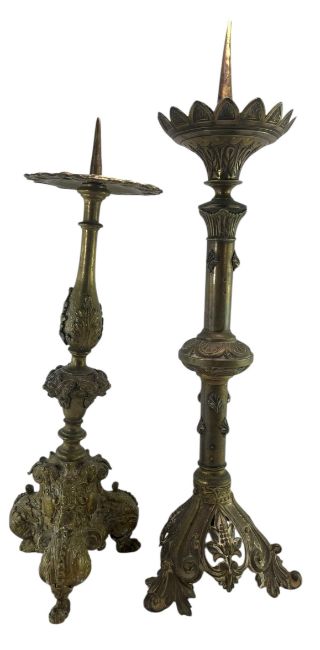 A matched pair of Baroque style 19th century brass ecclesiastical altar candlestick prickets. Each with a gadrooned edge spill dish over a relief-decorated body with floral motifs. Each raised on a heavily decorated tripod base.