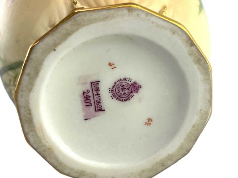 A Royal Worcester early 20th century hand painted porcelain lidded poutpourri jar. The vase having pierced outer lid, with smaller lid within. Hand painted baluster body with gilt cartouch to the shoulder and floral bouquets throughout an ivory colour body. Stamped to underside, RdN 472627, 2407.