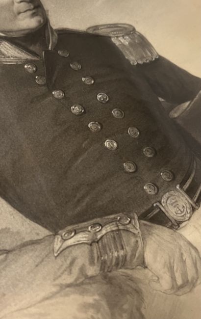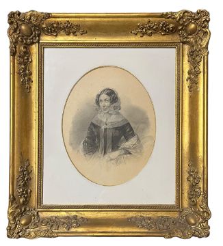 Captain Robert Streatfeild (British, 1786 - 1852) and his wife Dorothy Walters Cooper - a pair of 19th century graphite pencil and white wash heightened portrait paintings of Captain Robert Streatfeild and his wife in their latter years. The Captain is depicted in his uniform, holding a hat and looking ahead of him. The wife's portrait depicting her with a lace bonnet and satin dress. Each unsigned. Each is mounted in oval mounts and framed in giltwood ornate frames.