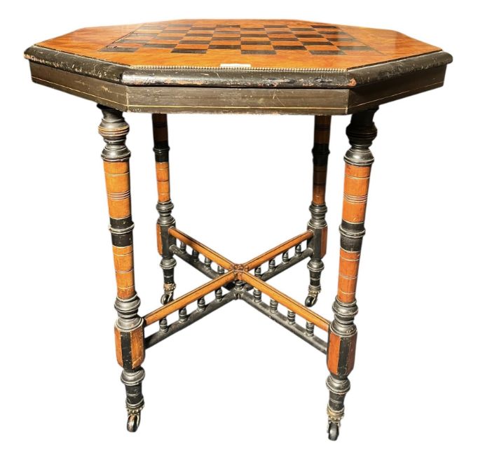 A late 19th century Victorian octagonal mahogany and inlaid games / chess table. The table having an inlaid chess top supported by ebonsied turned legs united by an X-frame stretcher with spindle galleries. All raised on castors.