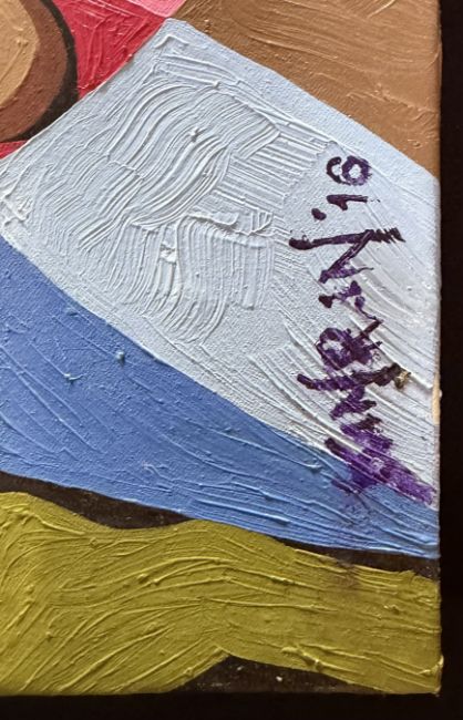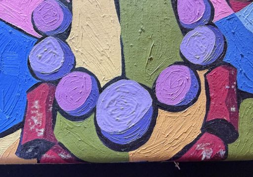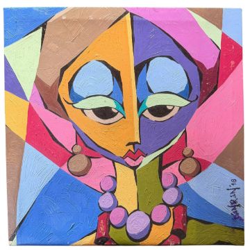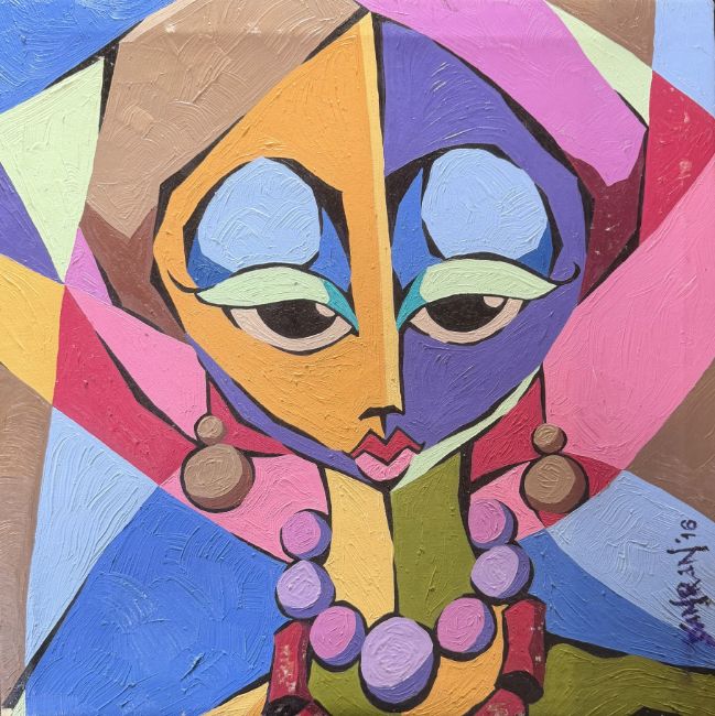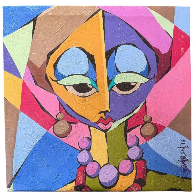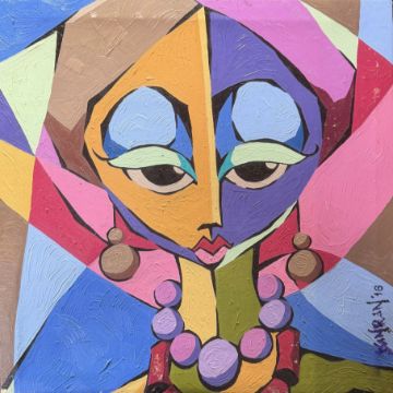 Olorunfemi Kinrin (Nigeria, Contemporary) - Untitled Portrait Female with Beaded necklace, 2016 - a Contemporary oil on canvas portrait painting of a lady with large beaded necklace and earrings on an abstract polychrome background. Signed and dated lower right. Unframed.