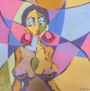 Olorunfemi Kinrin (Nigeria, Contemporary) - Untitled Female Nude, 2014 - a Contemporary oil on canvas painting of a female nude with large earrings on an abstract polychrome background. Signed and dated lower right. Unframed.