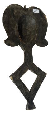 A Central Africa, Kota People, Gabon Region, wood, brass & copper reliquary figure. The figure having a face atop with shaped headdress and a triangular staff below. The surface embossed with relief copper and brass plaques.