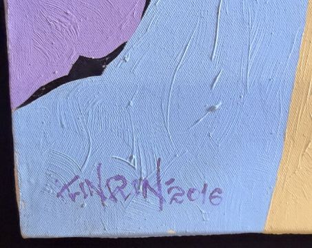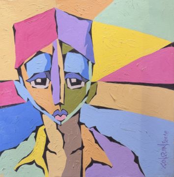 Olorunfemi Kinrin (Nigeria, Contemporary) - Untitled Portrait of Man with Cap, 2016 - a Contemporary oil on canvas portrait painting of a male subject with cap on an abstract polychrome background. Signed and dated lower right. Unframed.