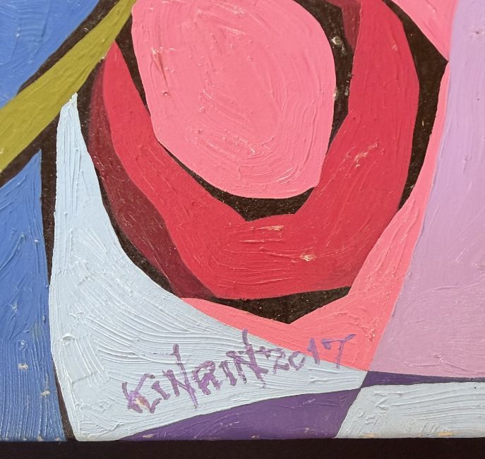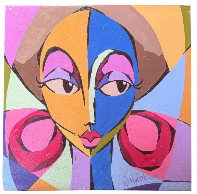 Olorunfemi Kinrin (Nigeria, Contemporary) - Untitled Female Portrait with Earrings, 2017 - a Contemporary oil on canvas portrait painting of a female subject with large earrings on an abstract polychrome background. Signed and dated lower right. Unframed.
