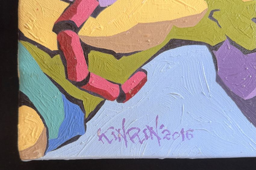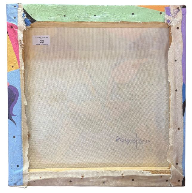 Olorunfemi Kinrin (Nigeria, Contemporary) - Untitled Couple Kissing, 2016 - a Contemporary oil on canvas portrait painting of a couple kissing on an abstract polychrome background. Signed and dated lower right. Unframed.