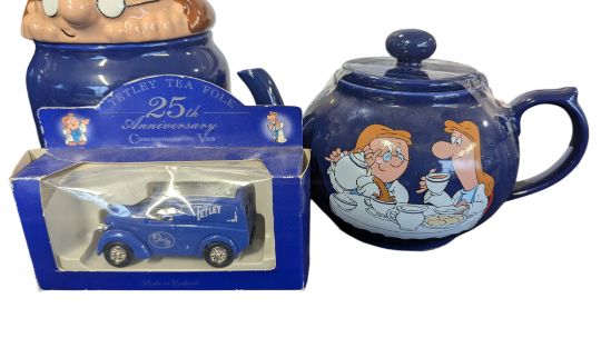 Collection of 1990s vintage Tetley tea memorabilia. To include Wade branded teapots, cookie jars, Lledo Tetley diecast cars, and a selection of toy plushie Tetley characters. Largest piece measuring approx 20cm tall.