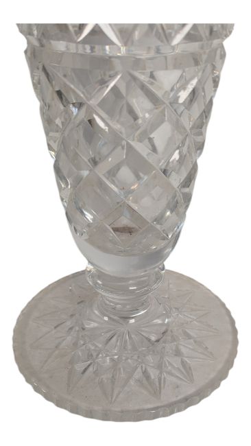 A pair of early 20th century large cut glass vases of trumpet form in the manner of Wateford. Each with circular bases, etched decoration to the sides being of trumpet form. Raised on large terraced cut glass bases.